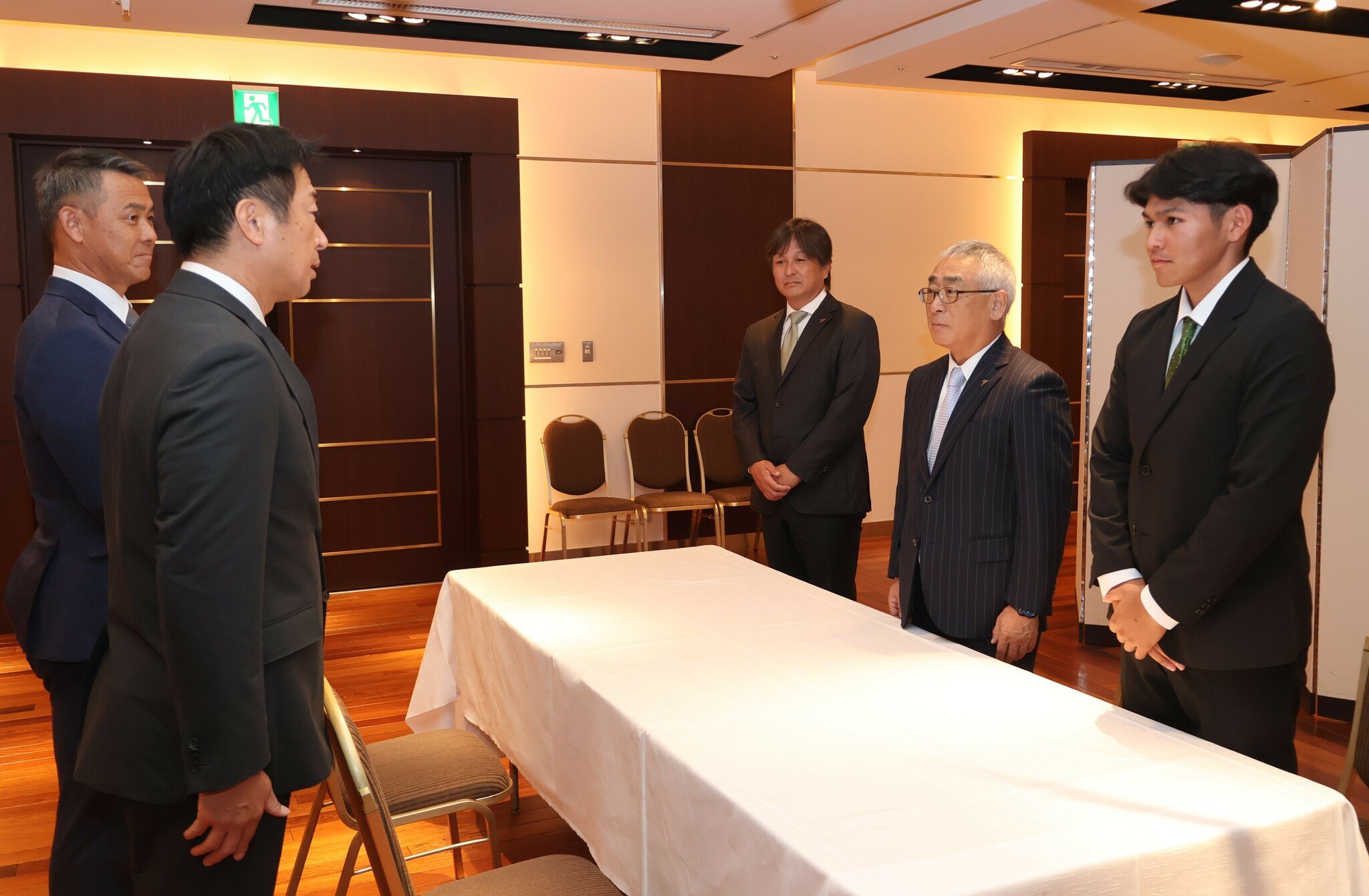 楽天の沖原佳典アマスカウトグループマネジャーと益田大介担当スカウトが訪問。富山の上原茂行監督と永森茂社長が同席した。
