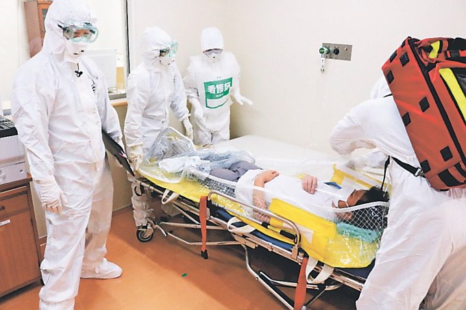 新型インフルエンザが流行している国からの帰国者が、発熱や喉の痛みを訴えたとの想定で実施。救急隊員が患者の状態を聞き取った上で同病院まで搬送し、診察や入院の受け入れまでの手順を確認した。患者は二次感染を防ぐためのシートに覆われた状態で搬送された。