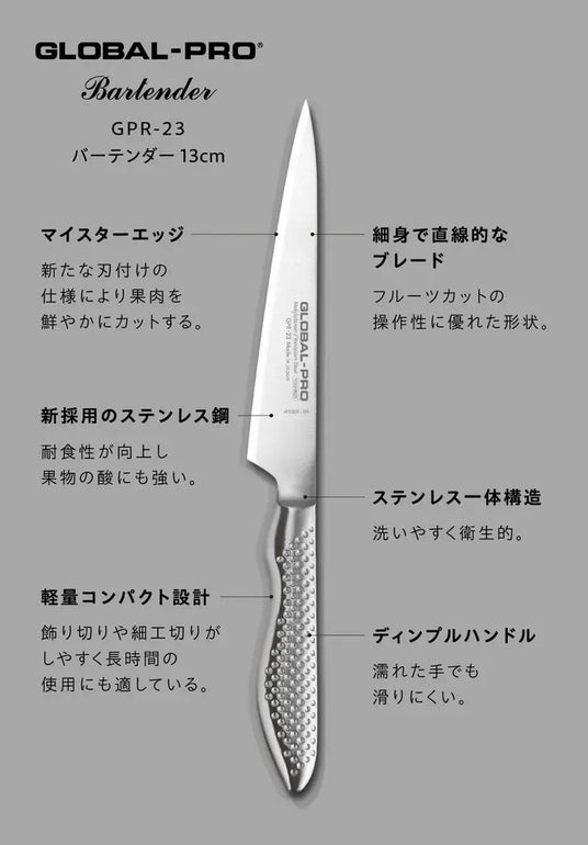 - 果実の香りや彩りを引き出す1本! "GLOBAL-PRO バーテンダー"が復刻。- オールステンレス包丁のパイオニアGLOBALの挑戦! シリーズ最高水準の切れ味を目指す。