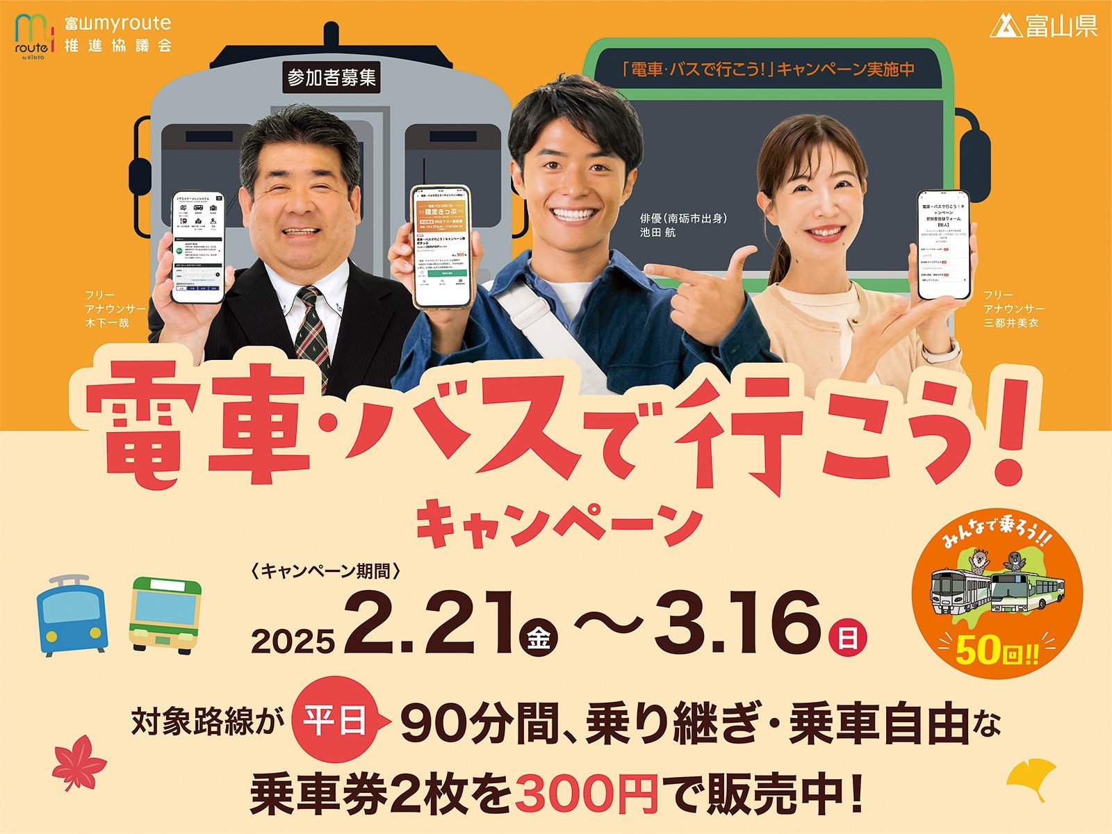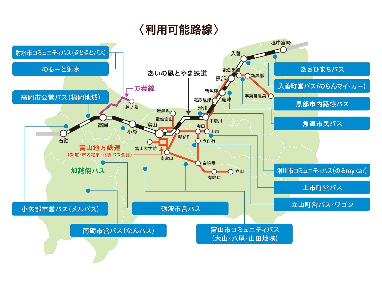 ・あいの風とやま鉄道、富山地方鉄道(鉄道・市内電車・バス)、万葉線、加越能バス、富山市コミュニティバス(大山・八尾・山田地域)、高岡市公営バス、 射水市コミュニティバス(きときとバス)、のるーと射水、魚津市民バス、滑川市コミュニティバス(のるmy car)、 黒部市内路線バス、砺波市営バス、小矢部市営バス(メルバス)、南砺市営バス(なんバス)、上市町営バス、 立山町営バス・ワゴン、入善町営バス(のらんマイ・カー)、あさひまちバス