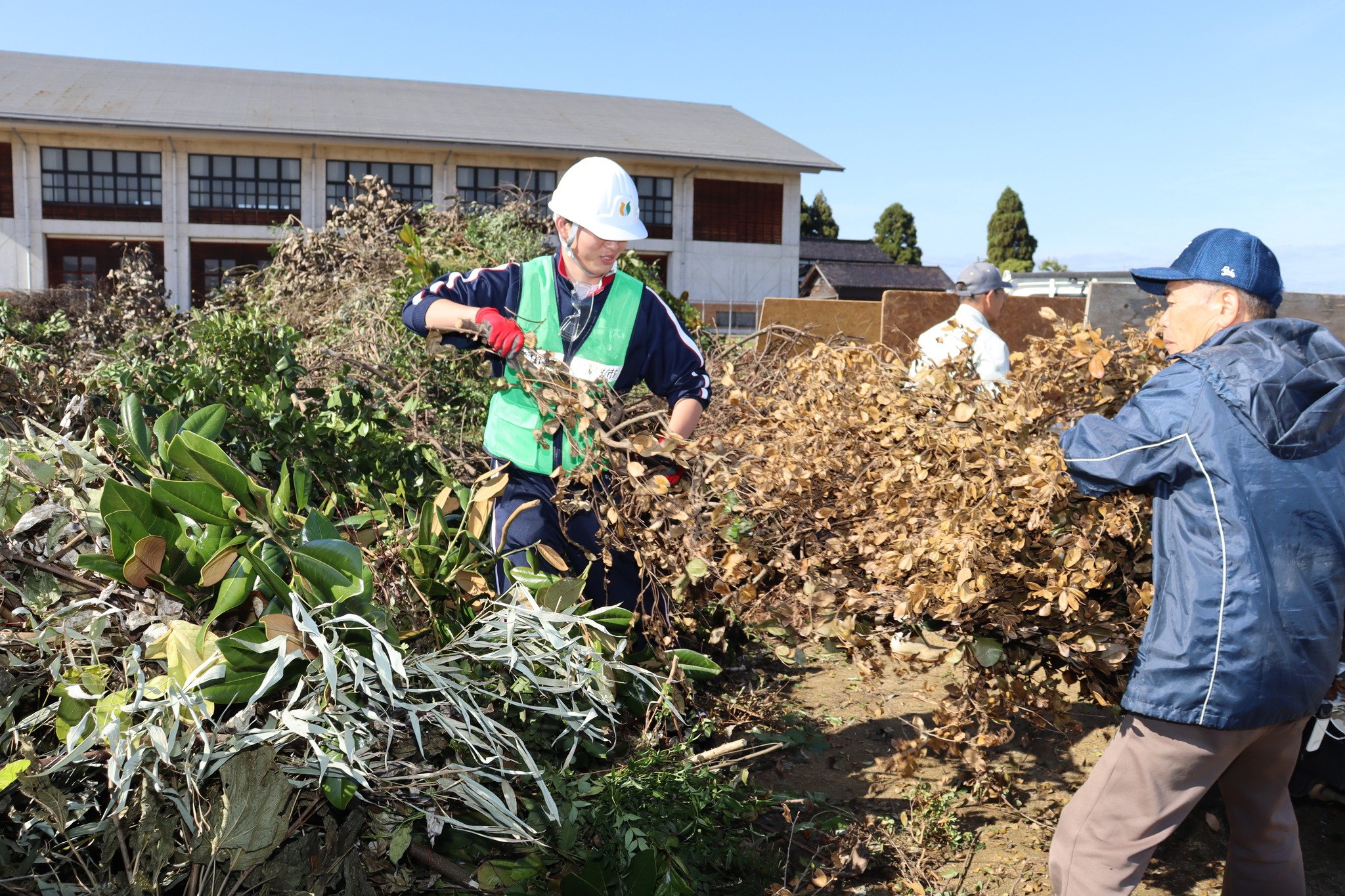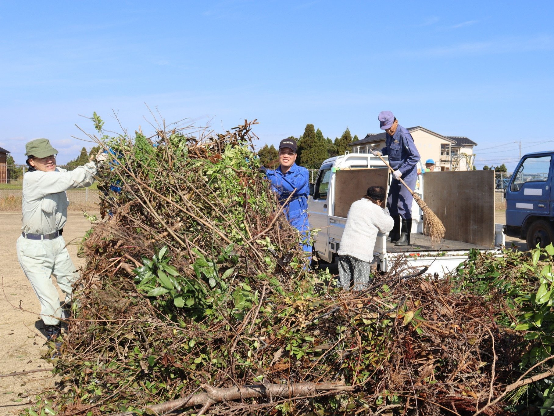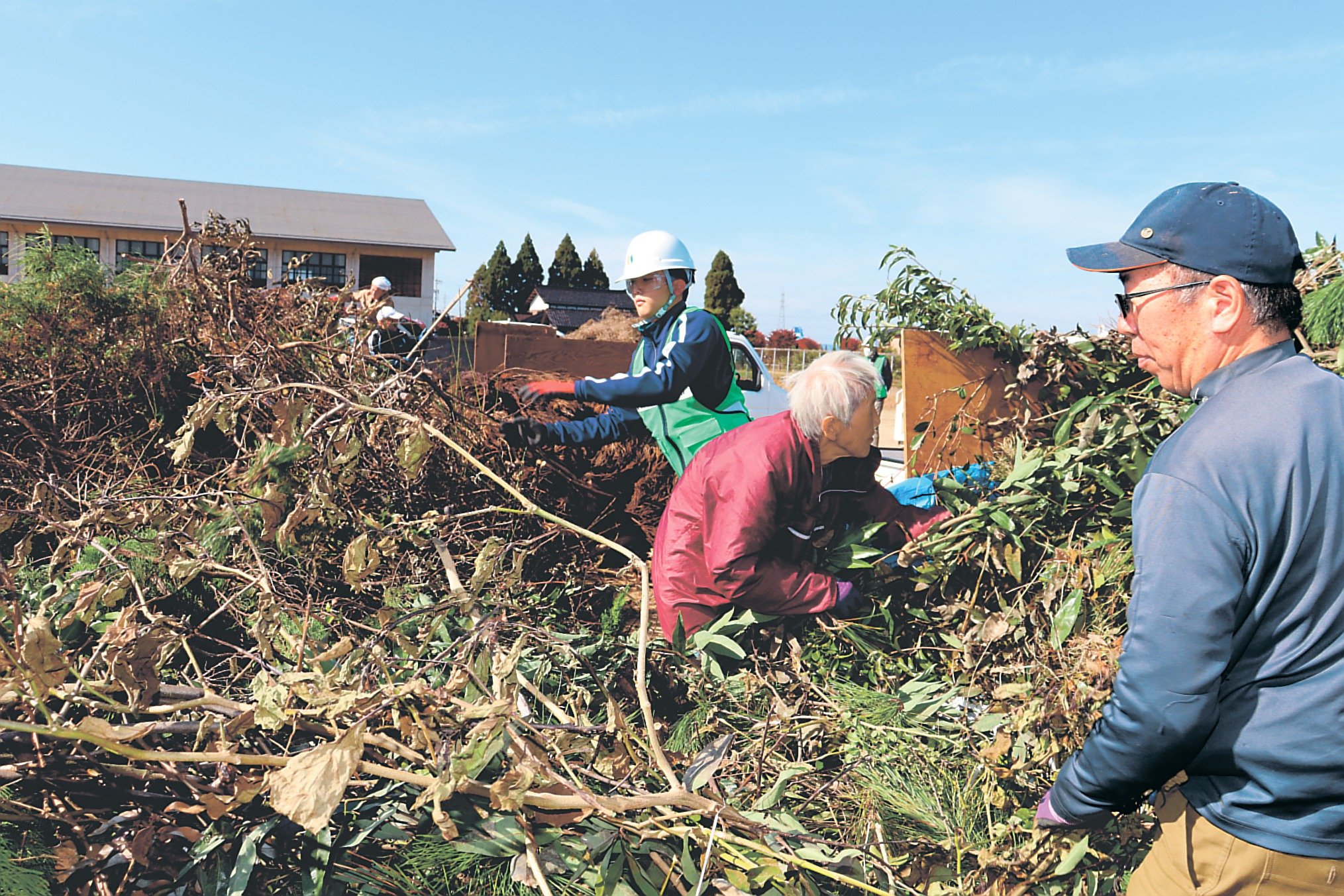 1人暮らしや高齢者宅の剪定枝を地域の自治会メンバーらがまとめて運ぶ姿もあった。4軒分を2台の軽トラックで3往復して運んだ秋南地区の副自治会長、魚誠市さん(62)は「地域で助け合いを続けていきたい」と話した。