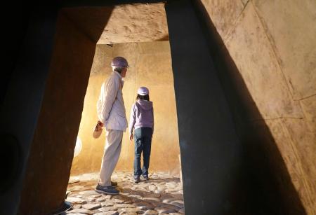 最下段は一辺32メートル、半球は直径16メートル。表面は無数の石で覆われ、どっしりしたたたずまい。復元前は木が茂る小山だったといい、古墳と知った時は「びっくりした」と、地元の保存会の進藤礼治郎さんは話す。隣接する展示館には原寸大の石室模型もあり、高度な技術の一端が垣間見られる。「有力者がこの地にいた証しです」と、進藤さんは誇らしげだ。