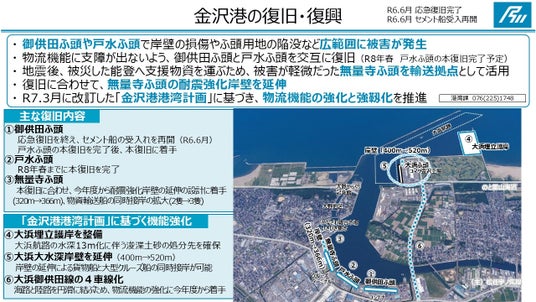 金沢港においても、能登半島地震において課題が顕在化しました。御供田ふ頭や戸水ふ頭については、岸壁の損傷やふ頭用地の陥没など広範囲に被害が発生しましたが、昨年6月に応急復旧を終え、御供田ふ頭でセメント船の受け入れを再開しています。