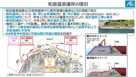 国、七尾市など関係機関と連携し、令和8年度中を目途に可能な限り早期の復旧を目指して取り組みます。