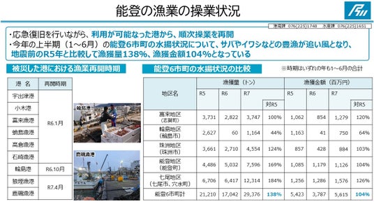 応急復旧を行いながら、利用が可能となった港湾、漁港から順次、操業を再開しています。こうした取り組みもあり、今年上半期(1~6月)における能登6市町の水揚状況については、サバやイワシなどの豊漁が追い風となり、地震前の令和5年と比較して漁獲量は138%、漁獲金額は104%となっています。