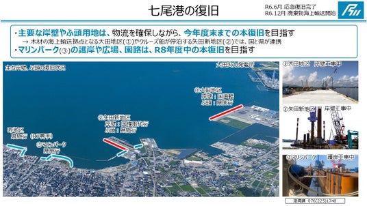 木材の海上輸送の拠点となる大田地区やクルーズ船が停泊する矢田新地区では、国と連携し、物流を確保しながら今年度末までの主要な岸壁やふ頭用地の本復旧を目指しています。また、マリンパークの護岸や物揚場の港湾施設に加え、広場や園路については、令和8年度中の本復旧を目指しています。