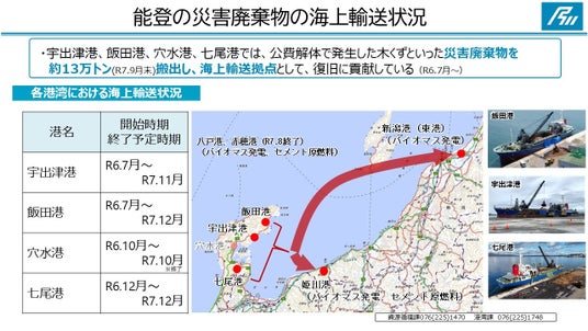 宇出津港、飯田港、穴水港、七尾港では、公費解体で発生した木材といった災害廃棄物をバイオマス発電の原材料とするため、新潟港などへ輸送する海上輸送拠点としての役割を果たしており、9月末までに約13万トンに及ぶ災害廃棄物を搬出しています。