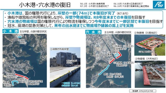 小木港については、国の権限代行により、今年9月に、一部区間(L=74m)の岸壁で本復旧が完了しました。また、漁船や遊覧船の利用を確保しながら、令和8年度末までに、岸壁や物揚場の本復旧を目指します。