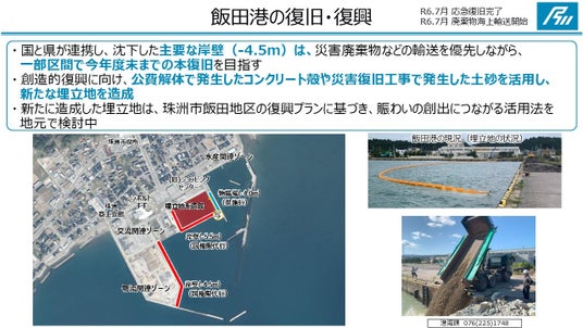 飯田港においても、国と連携して、沈下した主要な岸壁(-4.5m)について、災害廃棄物などの輸送を優先しながら今年度末までに一部区間で本復旧を目指しています。創造的復興に向け、公費解体で発生したコンクリート殻(がら)や災害復旧工事で発生した土砂を活用し新たな埋立地を造成するなど、機能強化を図っていきます。
