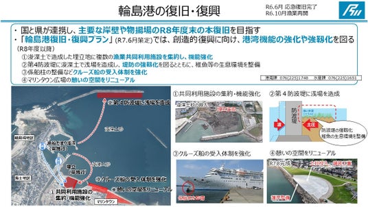輪島港では、国と連携し、令和8年度末までに、主要な岸壁や物揚場(ものあげば)の本復旧を目指しています。また、輪島港の創造的復興を図るため、国、県、市が連携して今年6月に策定した「輪島港復旧・復興プラン」では、港湾機能の強化や強靭化として、