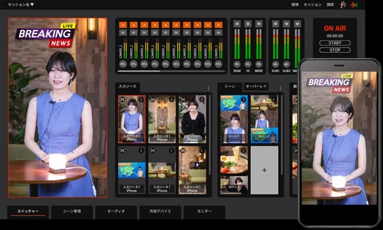 スマートフォンに最適化した縦型配信のクラウドスイッチャー機能に加え、低遅延通信により中継先との会話をスムーズに実現し、MCが遠隔から参加可能です。更に、簡単に遠隔操作できるPTZカメラコントロール機能により、少人数でのスタジオ運営も可能にします。