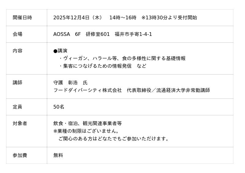 福井県初開催!今日から始める!基礎から学べる!「ベジタリアン」「ヴィーガン」「ハラール」「グルテンフリー」