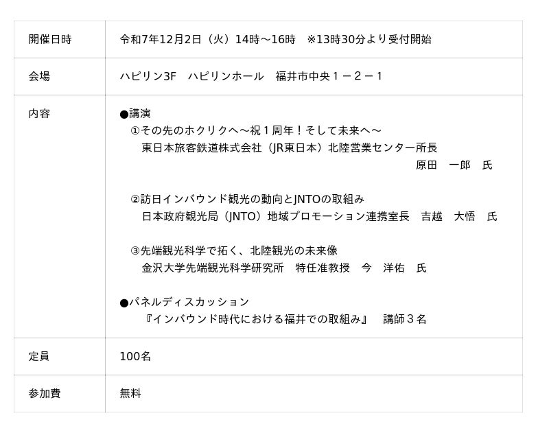 北陸新幹線開業効果の持続性・インバウンド誘客・観光関連データの活用をテーマに講演とパネルディスカッションを実施し、これからの福井に必要な観光の取組みについて、特に、宿泊業・運輸業・観光施設・飲食業・小売業などの観光関連事業者の方には参考になる内容となっております。