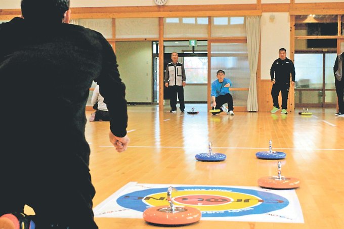 小松市今江から約20人が訪れ、計約40人が参加。混合チームで計8チームをつくり、得点を競った。参加者は「もう少し強く」「もっと右」などと声をかけ合い、交流を楽しんだ。