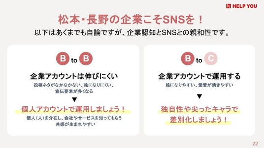 BtoB企業では、個人アカウントでの「顔出し・名前出し・社名出し」による信用度向上が、ビジネスの引き合いと採用応募を増やす鉄則であると紹介されました。