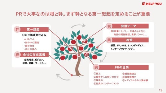 企業活動を「根:企業理念」、「幹:第一想起」、「枝:発信テーマ」、「葉:施策」、「実:PRの目的」に分けて整理し、一貫したメッセージで認知・ファン度を高めることが、売上と採用を伸ばす鍵であることが解説されました。
