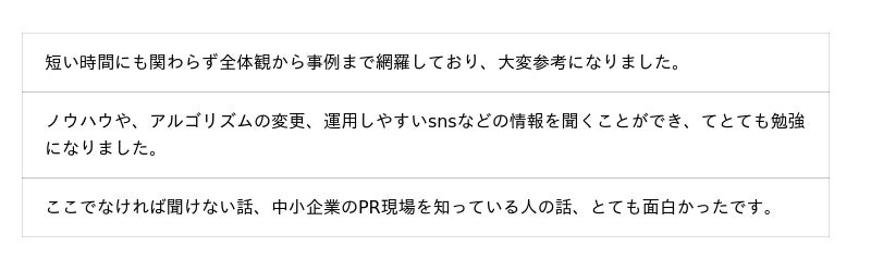本セミナーでは、成功事例をもとに、SNSを“やっている”から“活かして成果を出す”ための実践定期なPR術をお伝えしました。
