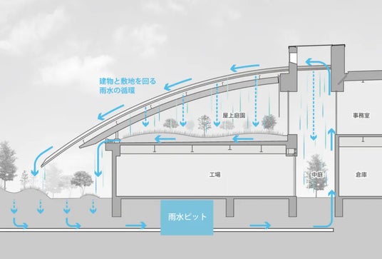 「雨をまとう」をテーマに、製品の特性を活かした雨水循環システムを建築とランドスケープに一体化した新社屋・工場である。屋上から降り注ぐ雨は植栽を潤し、緑や雨音として日常に取り込まれることで、働く環境に新鮮な感覚をもたらしている。中庭を介して事務所と工場をつなぎ、異なる分野の社員が互いを感じながら交流できる仕組みも工夫されている。さらに敷地外周を緑で包み、フェンスを設けず地域に開くことで、工業団地の硬さを和らげ、地域住民が憩える場へとつなげている。雨とともに人や地域を結ぶ、企業の姿勢を象徴する計画である。