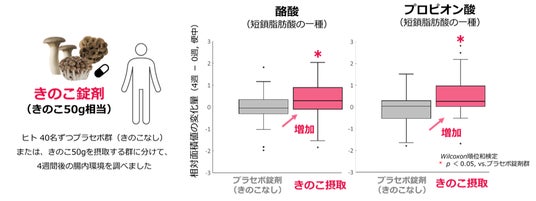 試験概要:本試験は、株式会社メタジェンとホクト株式会社の共同研究として実施しました。参加者80名を、きのこを含まないプラセボ錠剤を摂取する群と、マイタケ・ブナシメジ・エリンギから作製したきのこ錠剤を摂取する群に分け、4週間の摂取試験を行いました。その結果、4週間後にはプラセボ群に比べ、マイタケを含むきのこ錠剤群で、便中の短鎖脂肪酸の一種である酪酸およびプロピオン酸の有意な増加が認められました。