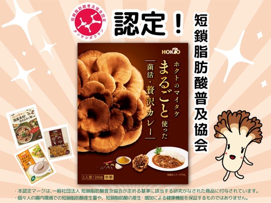 ホクト株式会社(所在地:長野県長野市、代表取締役社長 水野雅義)が販売するマイタケは、一般社団法人 短鎖脂肪酸普及協会より「短鎖脂肪酸を増やすのに適した食品」として既に、短鎖マーク付き商品として認定されています。