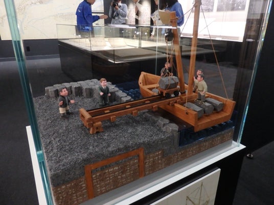 このほか会場には、鯖江市の人形作家、かとうかずおさん(73)が、エッシャーの描いた石材運搬方法の図面を立体化した模型も展示。高さ8センチほどの石塑粘土(紙粘土の一種)で作ったデ・レーケや日本人人夫の人形を配置し、船で東尋坊や雄島から運んできた岩を、どのようにして積み上げようとしていたのかが、分かりやすくなっている。