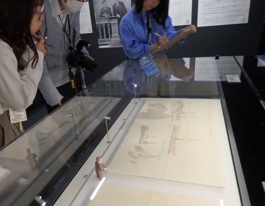 特別展「文明開化の華~龍翔小学校とエッセル堤~」の目玉展示は、オランダ人技師、G.Aエッシャー(1843₋1939年)直筆による「三国港突堤(エッセル堤)」の5点を含む工事関連図面6点で、今年5月ひ孫の治水研究者のヨリス・エッシャー氏(59)から同館に寄贈されたもの。一般向け公開は初めてとなる。