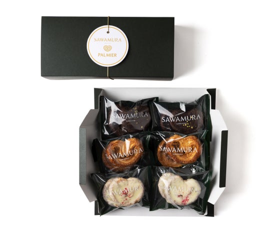 フランス語で「ヤシの木」を意味する「パルミエ」は、ハート型のフォルムが愛らしい伝統的な焼き菓子。薄く伸ばしたパイ生地を折りたたみ、砂糖をまぶして香ばしく焼き上げました。沢村では定番人気の3種類[ホワイトチョコ・フランボワーズ][チョコ・コーヒー][紅茶]を、2枚入りの個包装にして、それぞれ2袋ずつオリジナルギフトボックスに詰め合わせました。サクサクとした食感と豊かな風味が楽しめる小さな贅沢。ご自宅用にも、贈り物にも最適です。