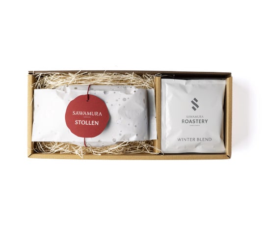 クリスマス前の「アドヴェント(待降節)」の時期に、少しずつ味わいながら食べるドイツの伝統菓子「シュトーレン」。沢村のシュトーレンは、自家製サワー種で発酵させた生地に、洋酒に漬け込んだレーズンやクランベリー、紅茶で煮たアプリコット、香ばしいナッツをたっぷりと練り込みました。シナモンやカルダモンの香り、ローマジパンのしっとりとしたコク、赤ワインで煮たイチジクの奥深い風味が重なり合う、豊かな味わいが特徴です。表面の粉糖にバターがほどよく馴染み、しっとりと落ち着いた頃が食べごろ。時間とともに深まる風味をお楽しみいただけます。さらに今年は、軽井沢の「沢村ロースタリー」で自家焙煎した冬限定コーヒー「ウィンターブレンド ドリップバッグ」とのギフトセットもご用意しました。コスタリカを中心に、ブラジル・エチオピアの豆を焙煎士が厳選しブレンド。ダークチョコレートのようなビター感と、ドライフルーツを思わせる上品な酸味が、シュトーレンとの相性を引き立てます。味わい深いお菓子と香り高いコーヒーが織りなす、冬のひとときをお届けします。