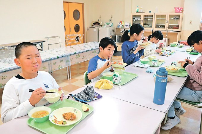 全校児童56人と同JAの桑原武仁常務理事、舟橋貴之町長らがランチルームで給食を食べた。この日の献立は町の給食の名物メニューでもある「豚カツの甘辛煮」などで、子どもたちは新米とともにおいしそうに頬張っていた。