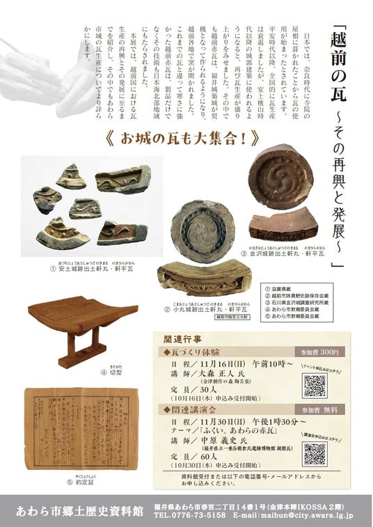 現在、あわら市郷土歴史資料館では令和7年度秋季企画展「越前の瓦~その再興と発展~」を開催中。地域の誇りである瓦生産の歴史を、貴重な資料とともに紹介しています。