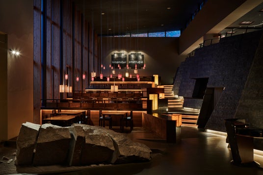 星のや軽井沢を象徴する棚田の景色を一望できる棚田ラウンジに、食前の一席を用意。ここでは、猪肉を使った一口サイズのおやきを火鉢に乗せて提供します。温かいジビエ料理とともに、夕日に染まる棚田の美しい情景を眺めながら、静寂に包まれる特別なひとときを過ごせます。