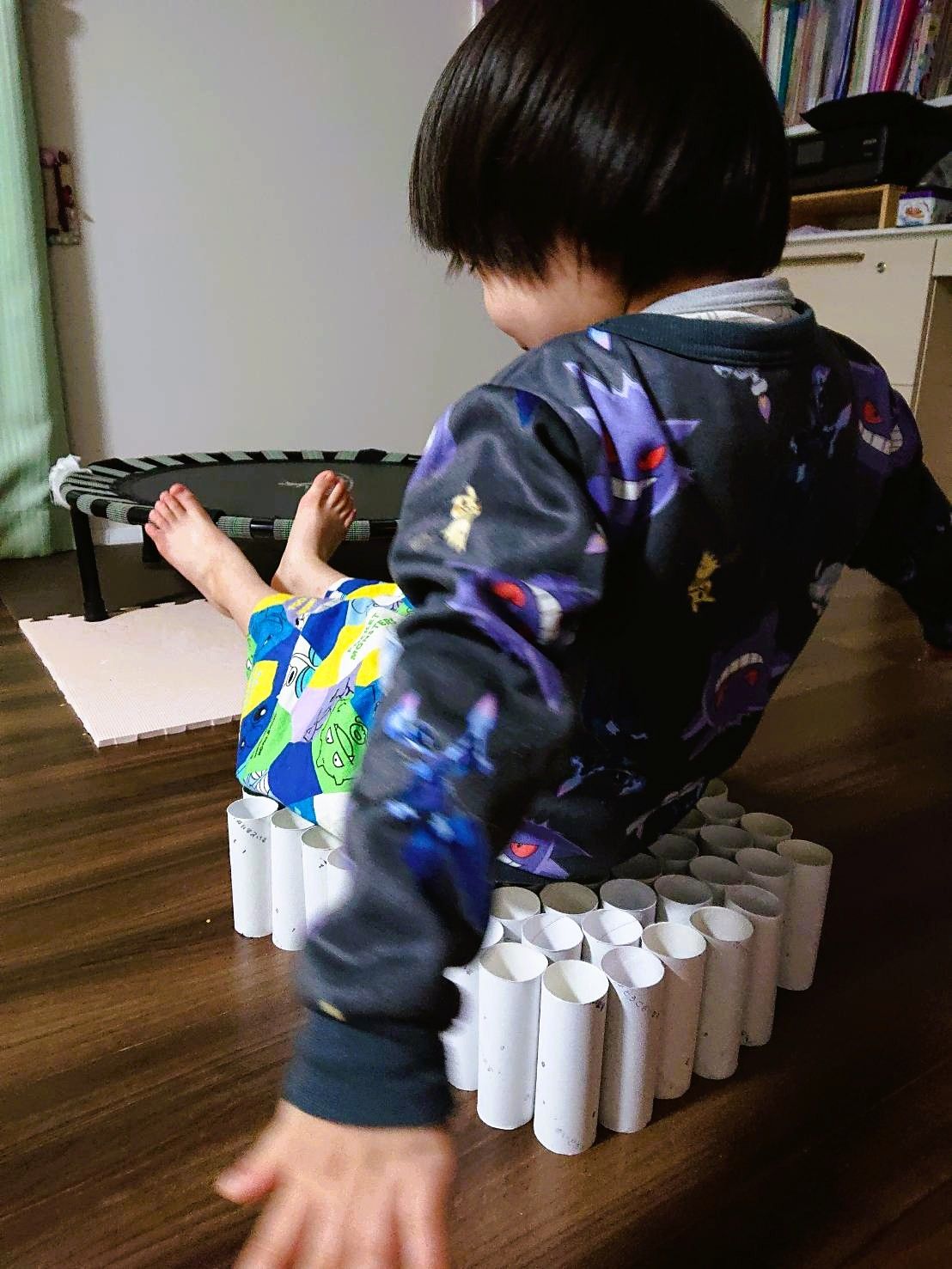 子どもたちがそれを見て、「トイレットペーパーの芯に乗ってみたい!!」と言うので、ひたすらトイレットペーパーの芯を集めました😅
