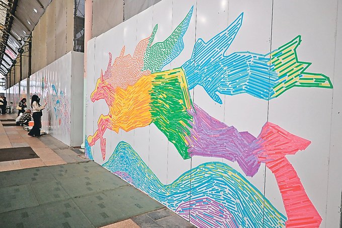 工事中の仮囲いの壁を、マスキングテープ(マステ)だけで描いたアート作品で彩る「まちなかマステアートコンテスト」が、富山市中央通りで開かれた。応募作品を22日まで展示し、通りを明るく照らす。