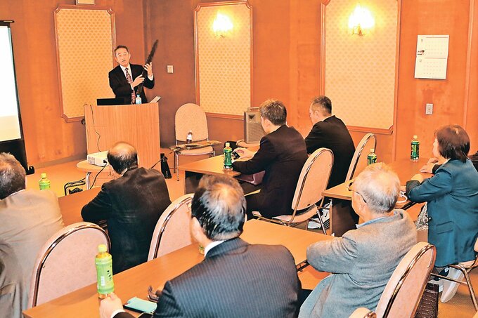 四十物昆布(富山県黒部市生地中区)の四十物直之会長は12日、同市コミュニティセンターで講演会を開き、石川県輪島市の経済団体のメンバーに「昆布と北前船」について解説した。