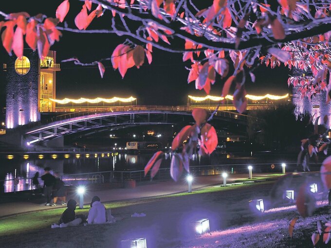 女性への暴力被害防止を呼びかける「とやまパープルリボンキャンペーン」が12日、県内で始まり、富山市の富岩運河環水公園が紫色にライトアップされた。