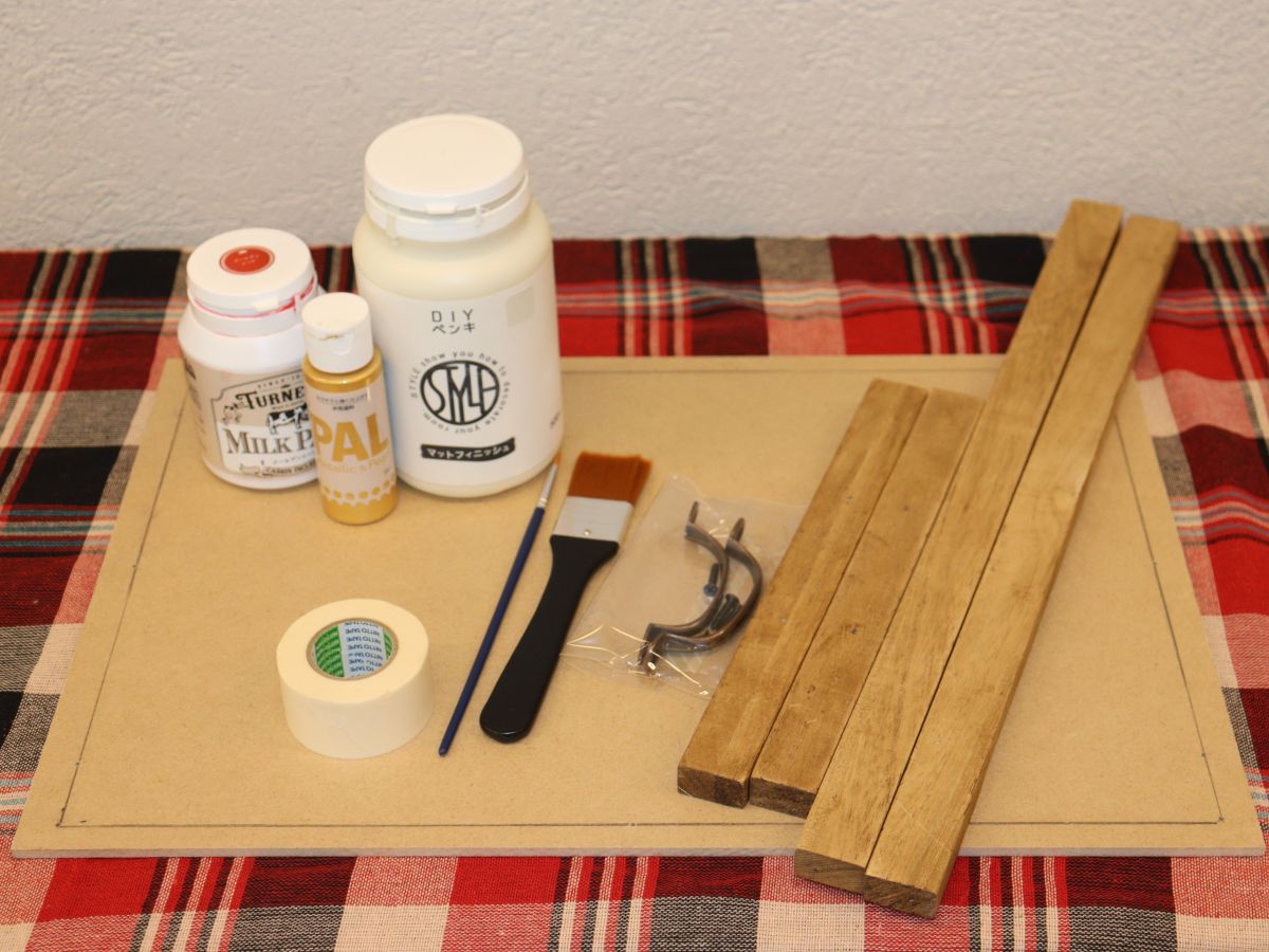 ※今回は、木製材料をカットした後、紙やすりで面取りし、セリアで購入できるオイルステイン(木部用ニス)で塗装したものを使いました。