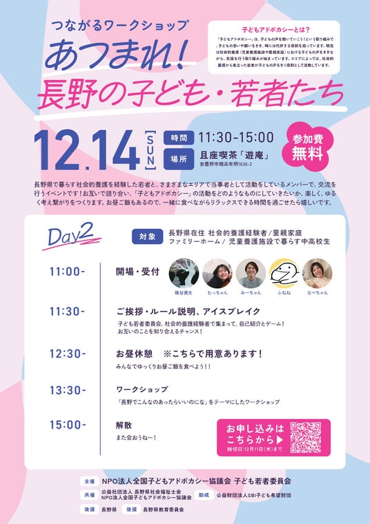 NPO法人全国子どもアドボカシー協議会(所在地:福岡県福岡市城南区、理事長:相澤 仁、中村みどり)は、子どもアドボカシー活動を拡げる新たな一歩として、2025年12月13日(土)、14(日)に長野県安曇野市でトークセッションやワークショップを通し、社会的養護経験者と市民の方々が共に子どもアドボカシーについて考えるイベントを開催します。全国各地で子どもアドボカシーに関する議論を深め、地域でのネットワーク構築と子どもの声を政策に反映するための基盤づくりを目的として、全国子どもアドボカシー協議会の子ども・若者委員のメンバーが企画をしました。
