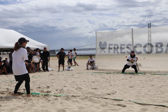 フレスコボールは、ブラジルのリオデジャネイロ発祥のビーチスポーツです。1945年にリオ・デ・ジャネイロのコパカバーナビーチで考案され、現在は世界各地のビーチで親しまれるようになっています。フレスコボールの最大の特徴は、向かい合う2人が競い合うのではなく、協力してラリーを続ける採点競技という点。競技時間は5分間、7mの距離を保って試合を行います。協力してラリーを続ける様子から「思いやりのスポーツ」とも言われています。