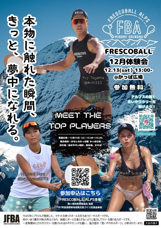 主催は、JFBA公認地域クラブ「FRESCOBALL ALPS」(代表:間渕将太氏、拠点:長野県駒ヶ根市)。11月の体験会には、2025年度日本代表として選出されたばかりの岡井花子/宮山有紀選手が講師として来駒することに。12月の体験会では、同じく日本代表の外山祐次/鈴木麻井子選手に加え、『FRESCOBALL JAPAN TOUR 2025』ミックス年間ランキング5位の原七海選手の参加が決定。日本トップ選手からレクチャーを受けられる豪華な体験会が二ヶ月連続で実現しました。