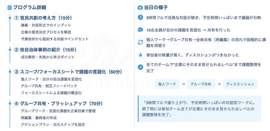 個人ワークとグループディスカッションを通じ、「なぜ課題が生まれているのか」「その解決が企業の収益にどうつながるのか」など、民間と対話するための“共通言語”を磨く時間となりました。