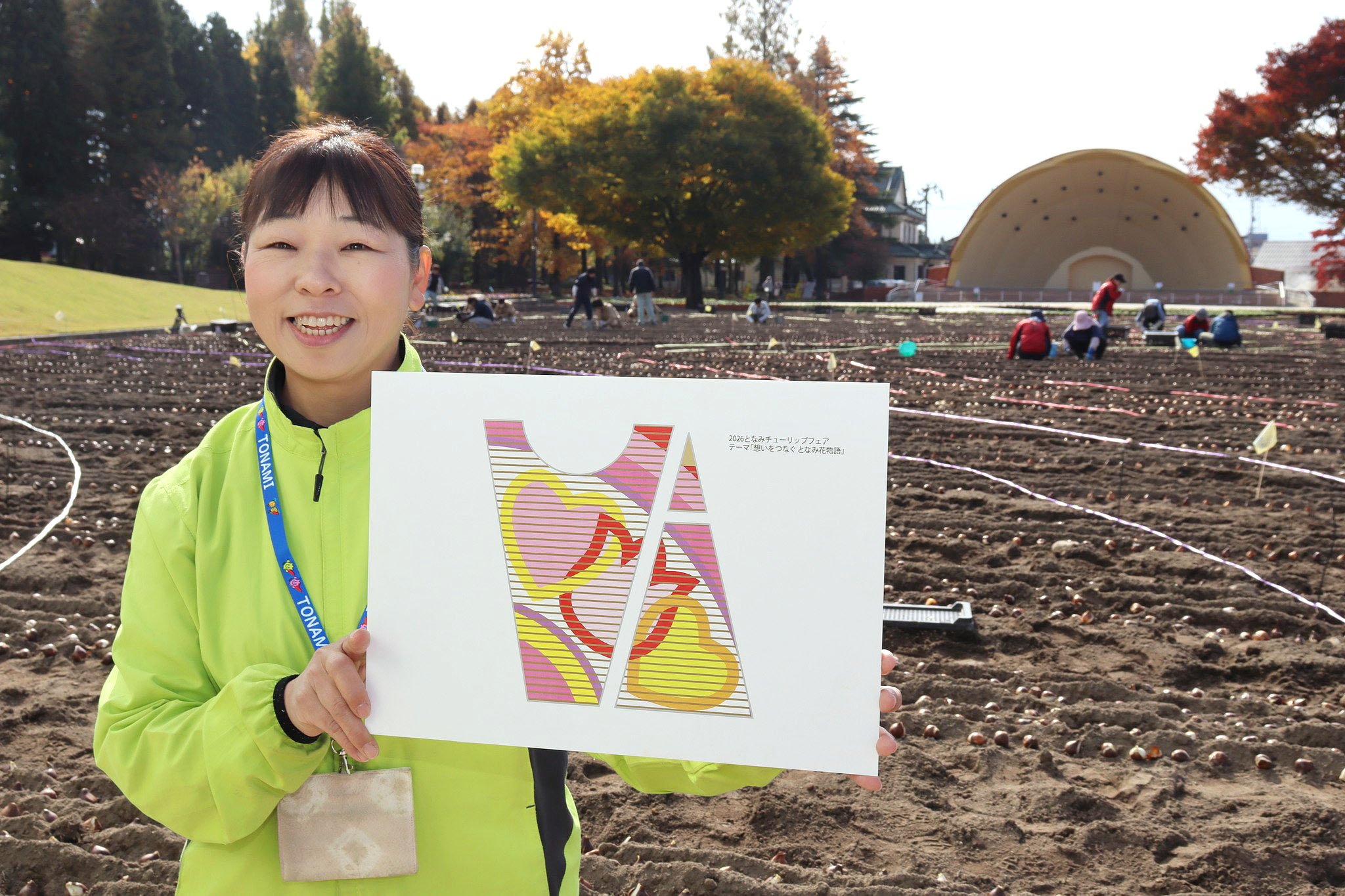 フェアは「想いをつなぐ となみ花物語」をテーマに、4月22日~5月5日に開催する。2600平方メートルある大花壇には、赤色の「レッドプラウド」「バーガンディレース」、桃色の「フィノラ」でチューリップを描く。ハートは黄色の「黄小町」、だいだい色の「チャーミングビューティ」などで表現する。開幕時に5割程度開花するよう、中生(なかて)2割、晩生(おくて)3割、極晩生5割を植え、最終日まで地上絵を楽しめるようにする。