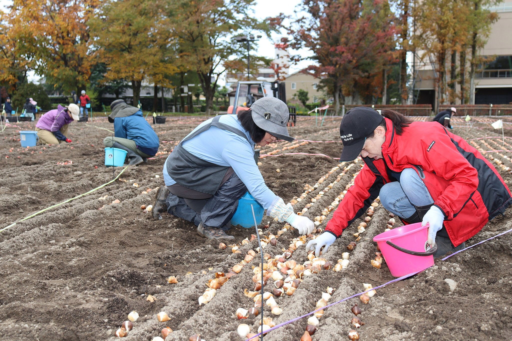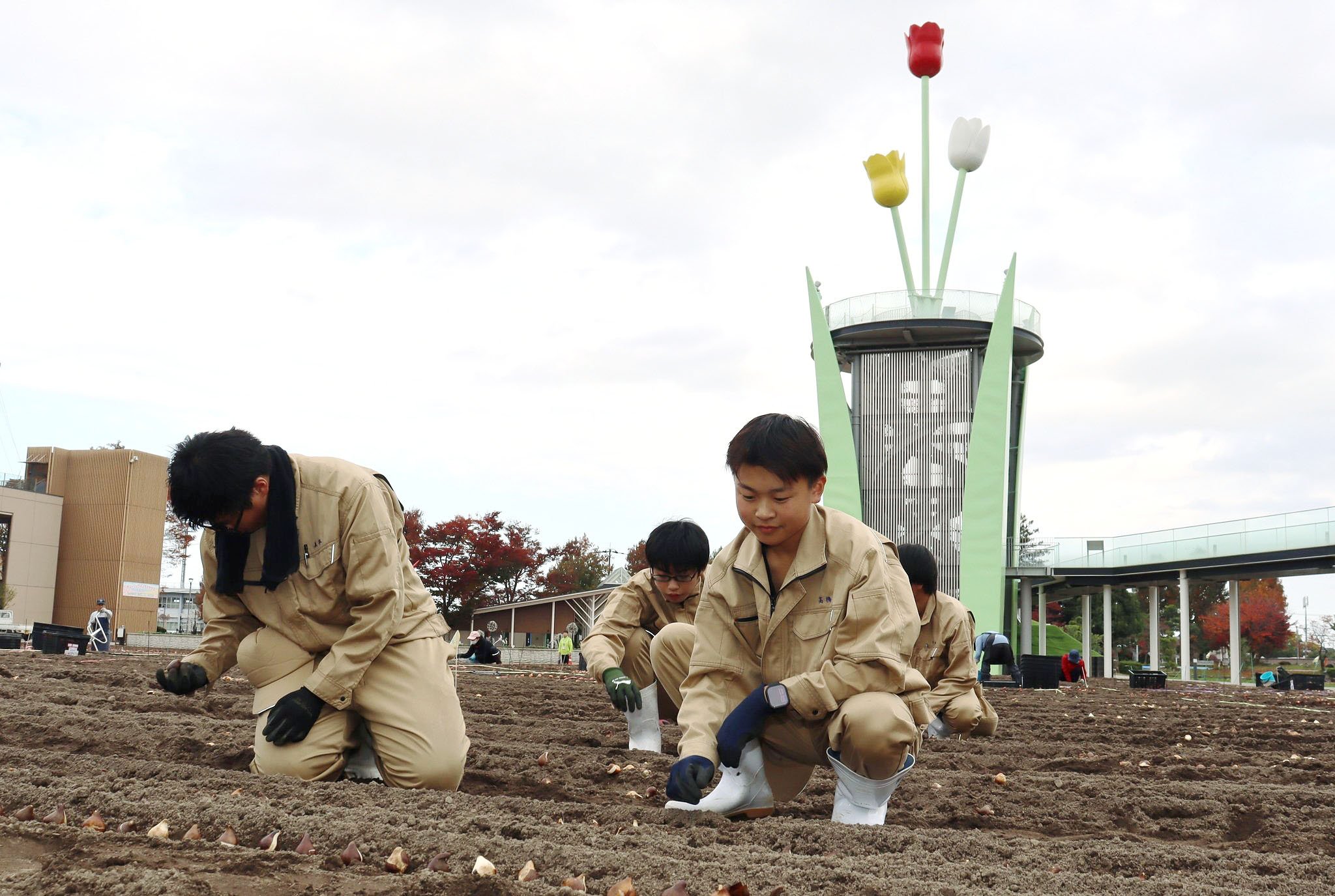 14日は大花壇で球根の植え込みが始まり、県花卉(かき)球根農業協同組合のスタッフや砺波市内の球根農家、小矢部園芸高校の1年生ら25人が丁寧に植えた。作業は20日ごろまで続く。同校の高橋歩夢さんは「間隔や向きに気をつけて植えた。美しく咲く花を見てもらいたい」と笑顔を見せた。