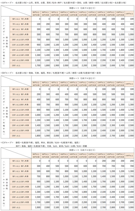 なお、燃油特別付加運賃は、シンガポールケロシン市況価格および為替レートの変動に応じて、 1ヶ月毎に見直しております。