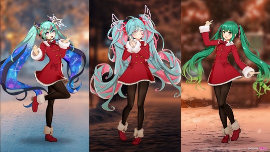 コンテンツ内には、2023年~2025年に開催された「初音ミク 夜空プログラム」の歴代の初音ミクが、クリスマスの特別コスチュームに身を包んで登場します。