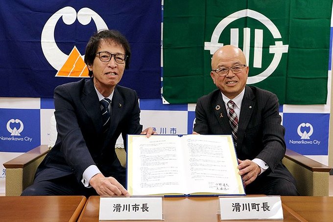 富山県の滑川市は17日、同じ「滑川」の地名を持つ埼玉県滑川(なめがわ)町と災害時相互応援協定を結んだ。大規模災害が起きた場合、物資や人員を相互に融通し合う。市役所で同日、締結式があり、水野達夫市長と大塚信一町長が協定書を交わした。
