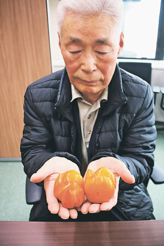 富山市豊城町の中村和雄さん(83)方で、ユニークな形をした柿の実が二つ収穫された。複数の突起や膨らみがあり、角度によってはかたつむりのようにも見える。中村さんは「見たことがない」と驚いている。