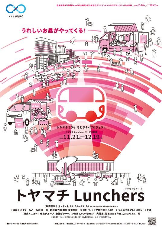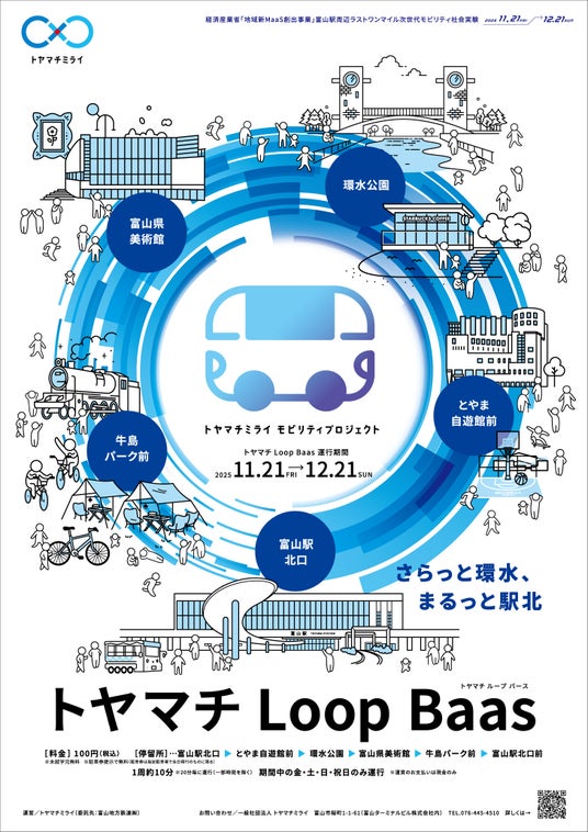 一般社団法人トヤマチミライ(富山市桜町一丁目1番61号 代表理事 立石善裕)は、令和6年の発足から、富山駅周辺で活動する企業や団体、自治体とともに作り上げ、また活動の理念として掲げている富山駅周辺エリアの「未来ビジョン」に基づき、各エリア(富山駅南、富山駅、富山駅北)の様々な方たちを「つなぎ・むすぶ」活動を地域の方たちと共に行っています。それらの活動を通じ、富山駅を中心とした地域の課題解消及び次世代を担うモビリティ活用方の検証を目的とした事業である経済産業省「地域新MaaS創出推進事業」富山駅周辺ラストワンマイル次世代モビリティ社会実験を2025年11月21日(金)より始動することをお知らせします。