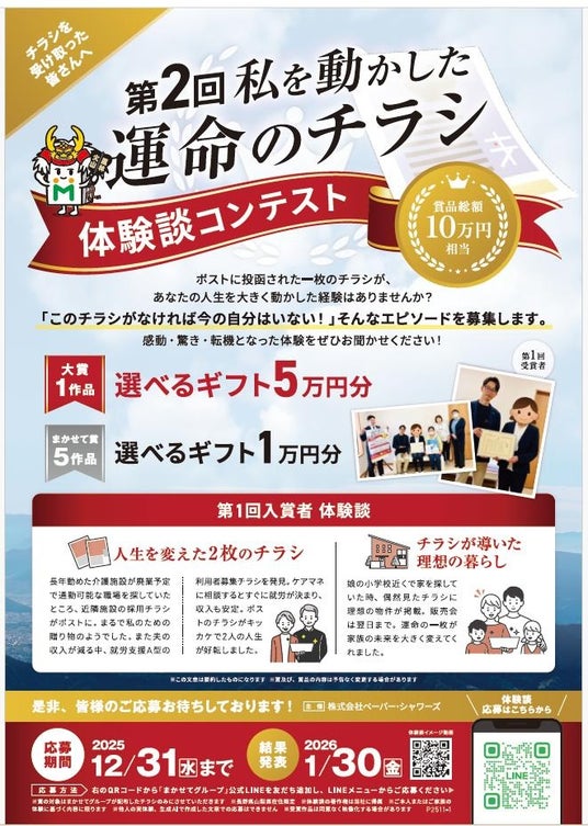 まかせてグループ(運営:株式会社ペーパー・シャワーズ/本社:長野県飯田市)は、「一枚のチラシが人生を変えることもある」をキャッチコピーにポスティングを全国に展開しており、今回2回目となる「人生を変えた1枚のチラシコンテスト」を開催いたします。