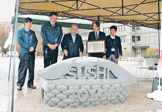 ベンチはモルタル製で幅約180センチ、高さと奥行きがいずれも約80センチ。ロゴマークを担当したデザイナーのアドバイスを受けながら、建設用3Dプリンターで造形した。シャリの質感、ネタの厚みなど細部にこだわって仕上げた。