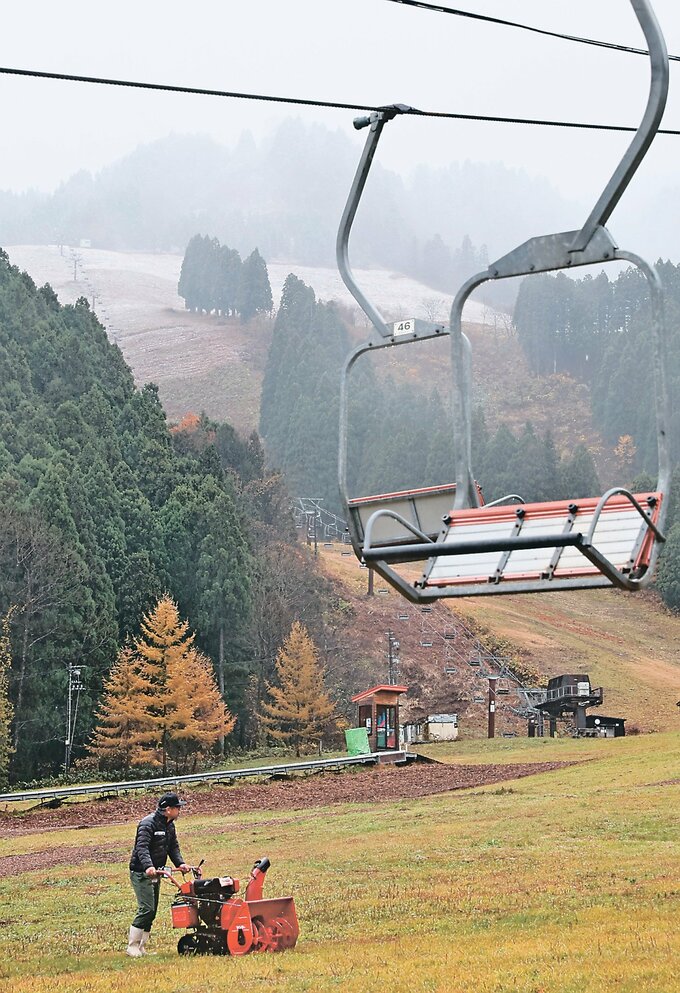 富山市のあわすのスキー場では、今シーズン初めてゲレンデの上部にうっすらと雪が積もり、白いグラデーションを描いた。松井一洋支配人によると昨年より10日ほど早く積もった。同スキー場では既にリフトの座席を設置しており、積雪次第で来月7日の安全祈願祭後にオープンする予定。